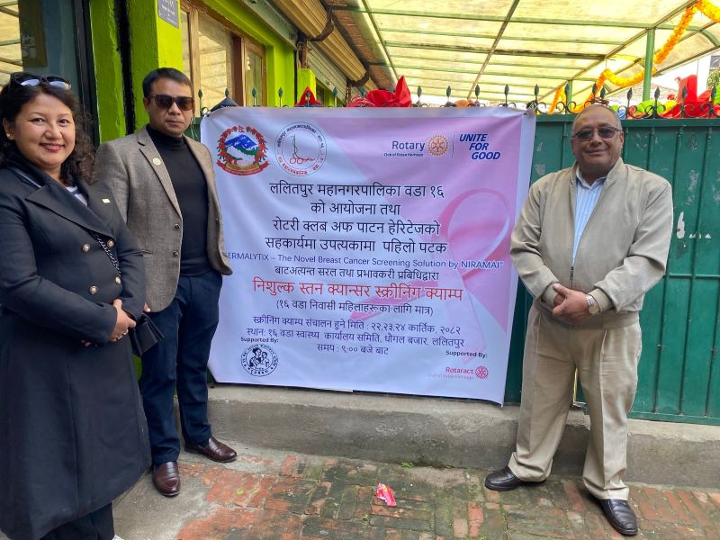 ललितपुर । ललितपुरमा स्तन क्यान्सर स्क्रिनिङ क्याम्प सञ्चालन भएको छ । ललितपुर महानगरपालिका वडा नम्बर १६ र रोटरी क्लब अफ पाटन हेरटेजको सहकार्यमा स्तन क्यान्सर स्क्रिनिङ क्याम्प आयोजना गरिएको हो । निःशुल्क आयोजना गरिएको क्याम्पबाट स्थानीय महिलाहरू लाभान्वित भएका छन् ।