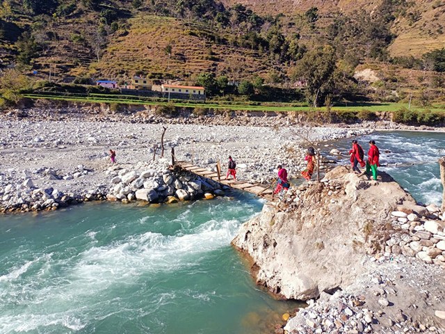 बझाङ । असोज ३१ र कात्तिक ३ गतेको परेको अविरल वर्षासँगै सेती नदीमा आएको बाढीले थलारा गाउँपालिकाको रेगम र केदारस्युँ गाउँपालिकाको देउरा बजार जोड्ने झोलुङ्गे पुल बगाएपछि हालिएको काठको साँघु तर्दै स्थानीयवासी । तस्वीर :रमेश केसी/रासस