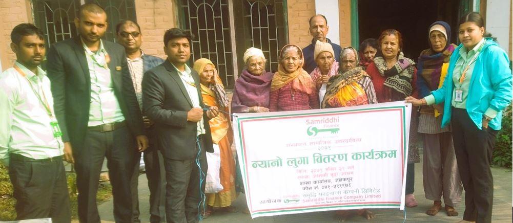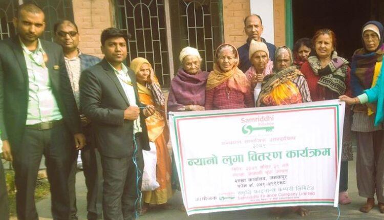 जनकपुर । समृद्धि फाइनान्सले जनकपुरमा न्यानो लुगा वितरण गरेको छ । फाइनान्सले जनकपुर वडा नं ८ मा रहेको जानकी वृद्धा आश्रममा वृद्धवृद्धालाई कम्बल वितरण गर्ने कार्यक्रम आयोजना गरेको थियो ।