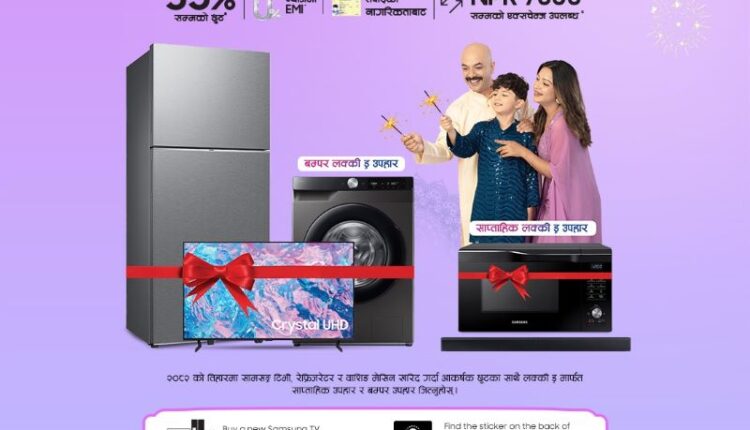 अफर असोज २६ देखि कार्तिक ३० गतेसम्म देशभरका अधिकृत सामसङ विक्रेतामा लागू हुनेछ । यस अवधिमा ग्राहकले सामसङका टिभी, फ्रिज र वाशिङ मेसिनमा आकर्षक छुटका साथ नयाँ भर्सनका उत्पादनहरू किन्न सक्नेछन् । जसले प्रकाशको यो पर्वलाई झनै उज्यालो बनाउनेछ ।
