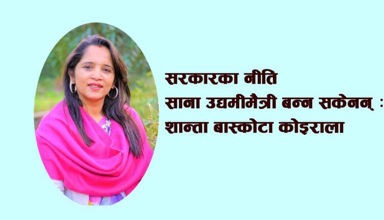 नेपालको अर्थतन्त्र सुधारको लागि साना तथा मझौला उद्योगको आफ्नै योगदान छ । बहुसंख्यक व्यवसायी यीनै व्यवसायमा आवद्ध पनि छन् तर तिनै व्यवसायी राज्यका नीतिका कारण समस्यामा परेको गुनासो सुन्नमा पाइन्छ । साना तथा मझौला व्यवसायीको व्यवसायिक अवस्था कस्तो छ ? महिला उद्यमीको अवस्था र समस्या के के छन् ? राज्यले अख्तियार गरेका नीति कति प्रभावकारी छन् ? यी र यस्तै विषयमा घरेलु तथा साना उद्योग महासंघकी एशोसियट उपाध्यक्ष तथा नेपाल अर्गानिक एशोसियसनकी महासचिव,नेपालको पहिलो अर्गानिक चिया उत्पादक कम्पनी कञ्चजंगा टि स्टेट रिर्सच सेन्टरकी प्रवन्ध निर्देशक सांग्रिला एग्रो वल्र्ड नेपाल टि आदि कम्पनीको संचालक शान्ता बाँस्कोटा कोईरालासँग आर्थिक आवाजकर्मी दीपा रेग्मीले गरेको कुराकानी :