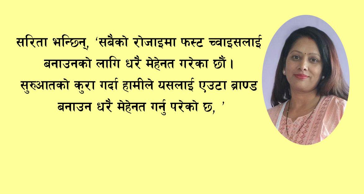 हरेकका भान्सामा ‘फस्ट च्वाइस’को मसला अर्थात उत्पादित वस्तु पु¥याउने लक्ष्य रहेको उनीहरू बताउँछन् । ‘सबैको रोजाइमा फस्ट च्वाइसलाई बनाउनको लागि धरै मेहेनत गरेका छौं । सुरुआतको कुरा गर्दा हामीले यसलाई एउटा ब्राण्ड बनाउन धरै मेहेनत गर्नु परेको छ, ’ सरिता सम्झिन्छिन्, ‘कुनै स्टाफ राखेका थिएनौं, आफै मसला बनाउनको लागि चाहिने समान ल्याउथ्यौं, सफा गथ्र्यौं, मेसिनमा राखेर पिन्थ्यौं, प्याक गथ्र्यौं, बजारमा लैजान्थ्यौं ।’