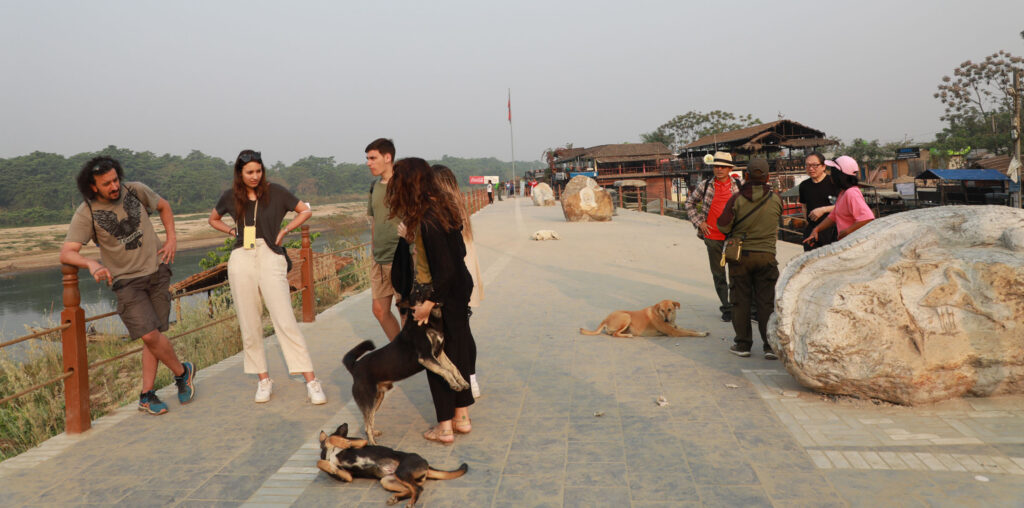 चितवन । पर्यटकीय नगर चितवनको सौराहमा सोमबार बिहान घुम्न आएका विदेशी पर्यटक राप्ती नदी किनाराबाट नदी तथा जङ्गलको अवलोकन गर्दै छन् । तस्वीर : रत्न श्रेष्ठ/रासस