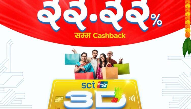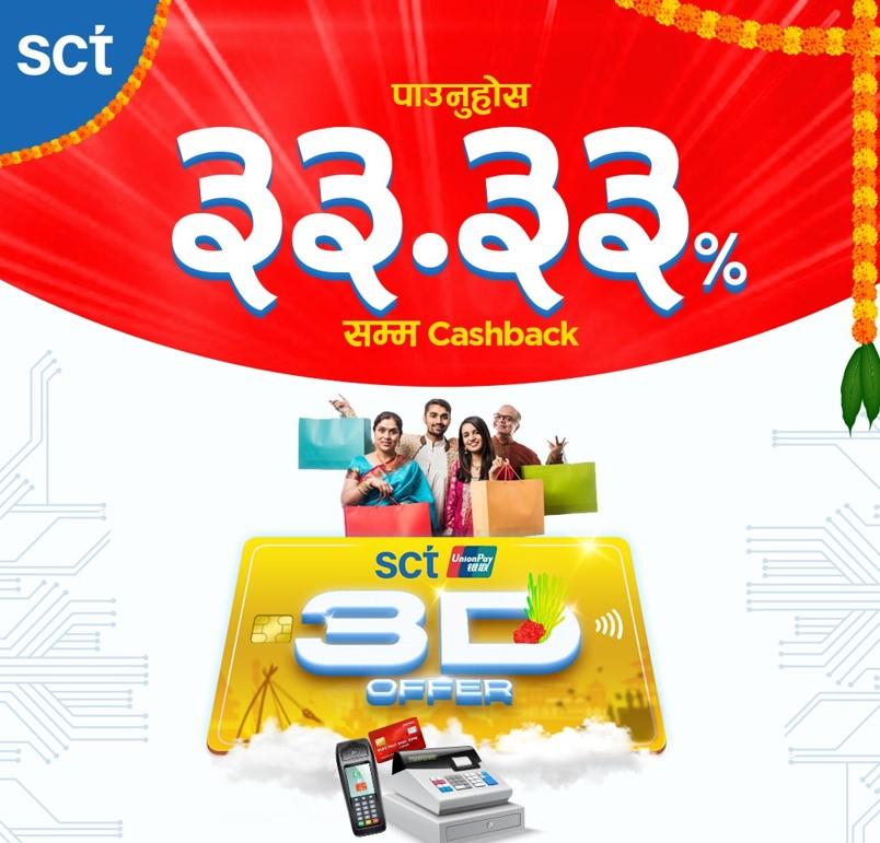 अफर अन्तर्गत एससिटी–यूपीआई डेबिट कार्ड प्रयोगकर्ताले कुनैपनि खरिदमा पोस मार्फत विद्युतीय कारोबार गर्दा ३३. ३३ प्रतिशतसम्म क्यास्ब्याक प्राप्त गर्न सकिने छ ।