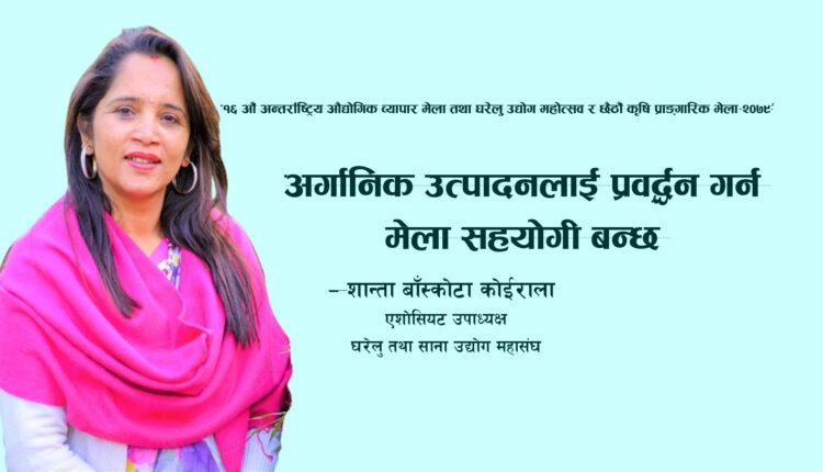 फागुन २ देखि ६ सम्म घरेलु तथा साना उद्योग महासंघ र नेपाल अर्गानिक एशोसियशनले संयुक्त रुपमा ‘१६ औं अन्तर्राष्ट्रिय औद्योगिक व्यापार मेला तथा घरेलु उद्योग महोत्सव र छैठौं कृषि प्राङ्गारिक मेला–२०७९’ काठमाडौंको भृकुटीमण्डपमा आयोजना गर्दैछ । आयोजकले मेलाको तयारी पुरा भएको जानकारी दिएको छ । मेलाको तयारी र व्यवस्थापनको सन्दर्भमा महासंघका एशोसियट उपाध्यक्ष तथा एशोसियशनका महासचिव समेत रहेकी शान्ता बाँस्कोटा कोईरालासँग आर्थिक आवाजकर्मी दीपा रेग्मीले गरेको कुराकानी :