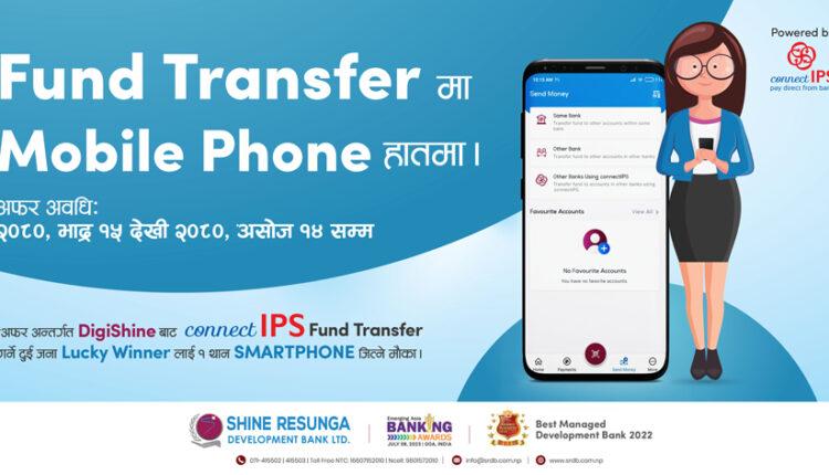 सो अफर २०८०, भदौ १५ गतेदेखि असोज १४ गतेसम्म लागु हुनेछ । मोबाइल बैकिङ एपमा उपलब्ध कनेक्ट आइपिएसलाई छनोट गरी फण्ड ट्रान्सफर गर्ने दुई जना प्रयोकर्ताहरुलाई अफरको अन्त्यमा विजेता घोषणा गरिनेछ । सोको जानकारी शाइन रेसुङ्गा डेभलपमेण्ट बैंकको आधिकारिक सामाजिक सञ्जालमा प्रकाशन गरिने छ ।