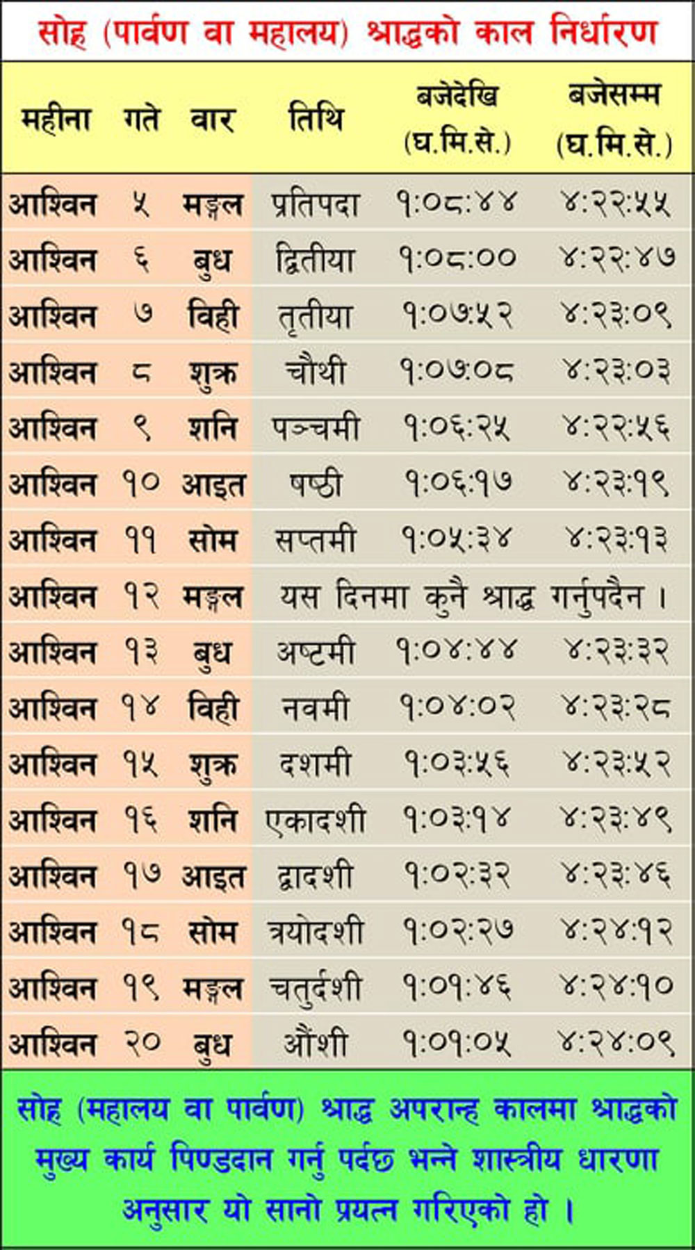 यसैगरी चतुर्दशी तिथि श्राद्ध असोज १९ गते मङ्गलबार १ः०१ देखि ४ः२४ बजेसम्ममा गरिसक्नुपर्ने सम्पादक पन्तले बताए । औँसी तिथि श्राद्ध असोज २० गते बुधबार दिउँसो १ः०१ देखि ४ः२४ बजेसम्ममा गरिसक्नुपर्नेछ । अपराह्नकाल पारेर पिण्डदान नगरेमा श्राद्ध गरेर पाइने फल पाउन नसकिने शास्त्रीय प्रमाण छ ।
