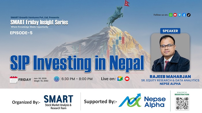 काठमाडौं । नेपालमा Systematic Investment Plan (SIP) को अवधारणा, यसको व्यावहारिक प्रयोग र दीर्घकालीन लगानी सम्भावनाबारे केन्द्रित SMART Friday Insight Series को आगामी कार्यक्रम यही शुक्रबार, माघ १६ गते (January 30, 2026) आयोजना हुने भएको छ।