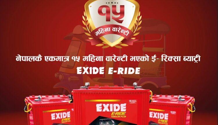 एक्साइड ब्राण्डको इ–रिक्सा ब्याट्री नेपालको एक मात्र १५ महिना लामो वारेन्टी भएको ब्याट्री हो ।विश्व प्रसिद्ध एक्साइड ब्राण्डको इ–रिक्सा ब्याट्रीहरु फ्याक्ट्रीबाट पहिले नै चार्ज हुने भएकोले सिधा जडान गर्न सकिने छ । साथै विशेष अलोई प्रणाली भएका यी ब्याट्रीहरुले छिटो चार्ज हुनुका साथै प्रशोधित पानीको पनि कम खपत गर्छन ।