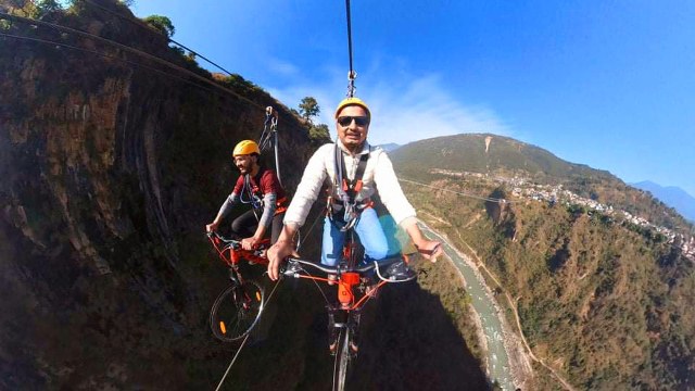 स्काइ साइक्लिङ गर्दै पर्यटक