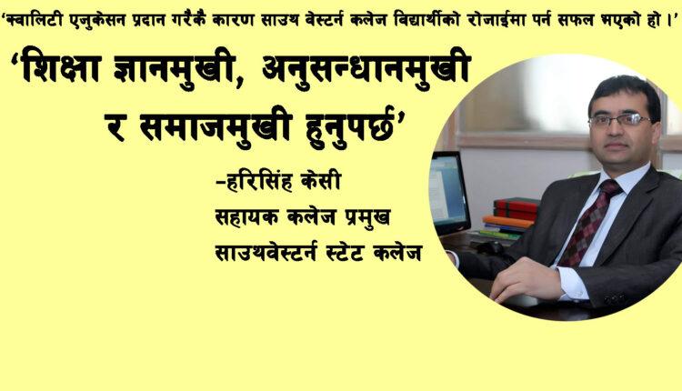 शिक्षाआर्जन महत्वपूर्ण र संवेदनशील विषय हो । धेरै विकल्पका बीत विद्यार्थी तथा अभिभावकमा उच्च शिक्षा अध्ययनको लागि कुन विषय रोज्ने भन्ने कुराले सधै सताइरहेको हुन्छ । साउथवेस्टर्न स्टेट सहायक कलेज प्रमुख हरिसिंह केसी सबै विषय आफैमा राम्रो भएपनि विद्यार्थी र अभिभावकले आफ्नो क्षमता, आवश्यकता, रूची लगायतका विषयमा ध्यान दिएर विषय रोज्नुपर्ने बताउँछन् , यी विषयसहित साउथ वेस्टर्न स्टेट कलेजका सन्दर्भमा आर्थिक आवाजका लागि दीपा रेग्मीले सहायक कलेज प्रमुख केसीसँग गरेको कुराकानी :