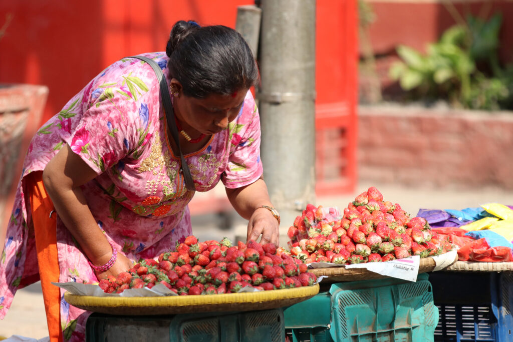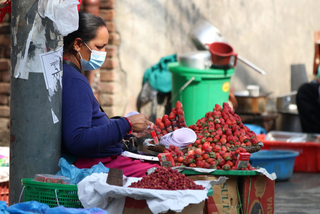 काठमाडौं । सडक व्यापारीहरु काठमाडौंको न्यूरोडमा बिक्रीका लागि राखिएको स्ट्रबेरी मिलाउँदै छन् । उनीहरु हरेक दिन बिहान ७ बजेदेखि साँझ ७ बजेसम्म मौसम अनुसारको फलफूल बेच्ने गर्छन् । तस्बिर : प्रदीपराज वन्त/रासस