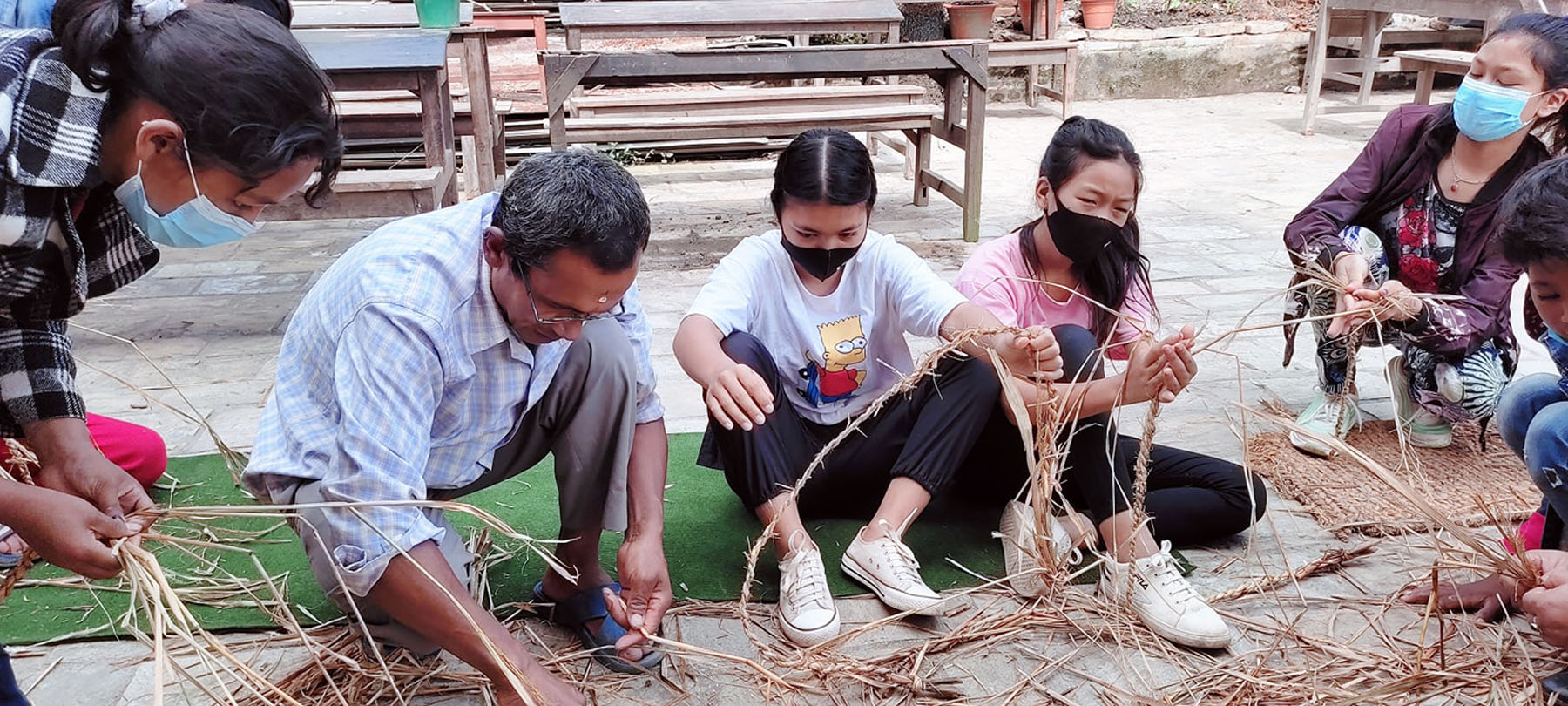 भक्तपुरको शारदा माध्यामिक विद्यालयमा सुकुल बुन्न सिक्दै विद्यार्थीहरु । सो विद्यालय शिक्षालाई उत्पादन श्रमसँग जोड्दै विभिन्न सीपमूलक व्यवहारिक शिक्षा पनि प्रदान गर्न थालेको छ ।