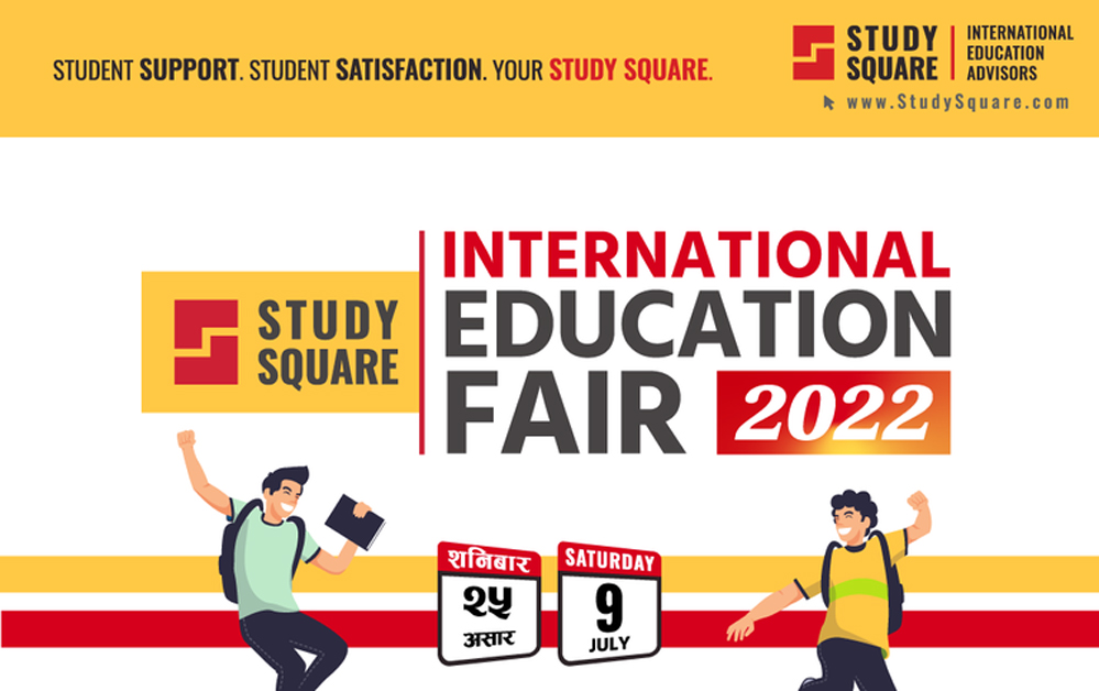 काठमाडौं । उच्च शिक्षा अध्ययनका लागि अष्टेलिया, क्यानडा, यूके र युएसए जान चाहाने विद्यार्थीलाई मध्यनजर गरि स्टडी स्क्वायरको आयोजनामा इन्टरनेशनल एजुकेशन फेयर २०२२ हुने भएको छ ।