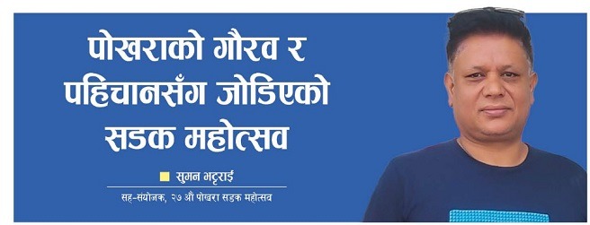 अंग्रेजी नयाँ वर्षको अवसरमा पोखरामा आयोजना हुन लागेको २७ औं संस्करणको पोखरा सडक महोत्सवमा म सम्पूर्ण स्वदेशी तथा विदेशी पाहुनालाई हार्दिक आमन्त्रण गर्दछु । नयाँ वर्षलाई उत्साह, उमंग र खुसीका साथ मनाउन हामी सबैलाई सडक महोत्सवमा स्वागत गर्न आतुर छौं । पोखरा सडक महोत्सव केवल उत्सव मात्र होइन, पोखराको पहिचान र गौरवसँग जोडिएको एक महत्वपूर्ण कार्यक्रम हो । सडक महोत्सवमा बालबालिका, सेफ, युवा, परिवार, आन्तरिक तथा बाह्य पर्यटकलाई लक्षित गरी विभिन्न मनोरञ्जनात्मक तथा सिर्जनात्मक प्रतियोगिताहरू आयोजना गरिनेछन् ।