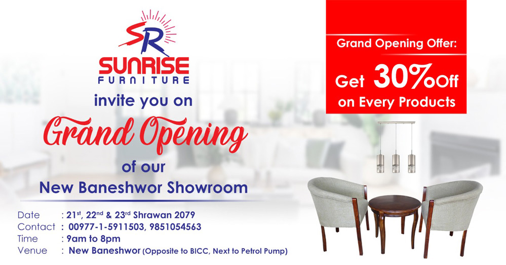 आकर्षक गोदामसहित नयाँ बानेश्वरमा सनराइज फर्निचरको तेस्रो शोरुम स्थापना भएको हो । शोरुम उद्घाटनको अवसरमा साउन २१ देखि २३ गतेसम्म ३० प्रतिशत छुट प्रदान गरिने सञ्चालक सुमन बस्नेतले जानकारी दिए । शोरुम स्थापनाको अवसरमा ३ दिनसम्म प्रदान हुने विशेष छुटबाट धेरै ग्राहकहरु लाभान्वित हुनेमा आफू विश्वस्त रहेको बस्नेतले बताए ।