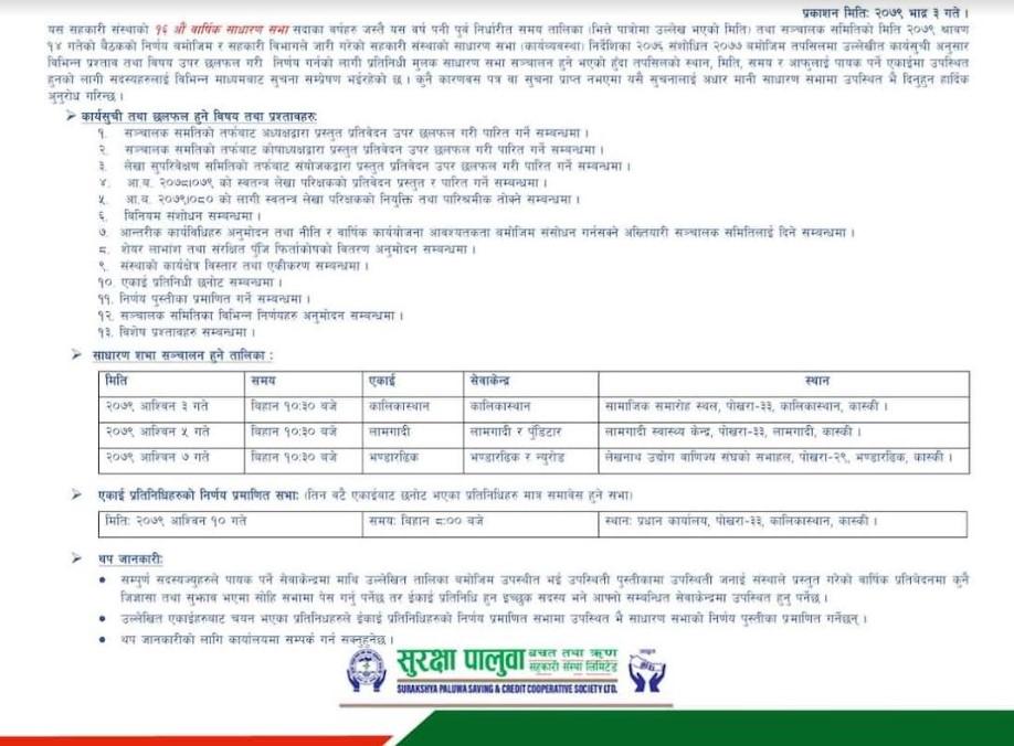 पोखरा  । सुरक्षा पालुवा बचत ऋण सहकारी संस्था लिमिटेडको साधारण सभा आगामी असोज ३ गतेदेखि १० गतेसम्म हुने भएको छ । यस सहकारीको ३ वटा सेवा केन्द्रको साधारण सभा फरक-फरक मितिमा हुने सूचनामा उल्लेख गरिएको छ ।