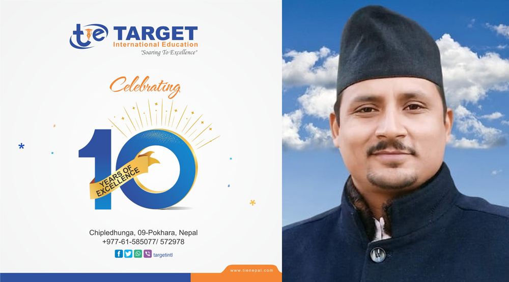 पोखरा । पोखराको चिप्लेढुंगामा प्रधान कार्यालय रहेको टार्गेट इन्टरनेशनल एजुकेसन प्रा.लि.ले आफ्नो स्थापनाको १०औं वर्ष पुरा गरेको छ । सन् २०१२ मा स्थापित टार्गेट इन्टरनेसनल एजुकेशनले विशेष गरि अस्ट्रेलिया, क्यानडा, न्युजिल्याण्ड, बेलायत, डेनमार्क तथा अमेरिका लगायतका देशहरुमा उच्च शिक्षा अध्ययनका लागि जान चाहने विद्यार्थीलाई गुणस्तरीय सेवा निरन्तर प्रबाह गर्दै आइरहेको छ ।