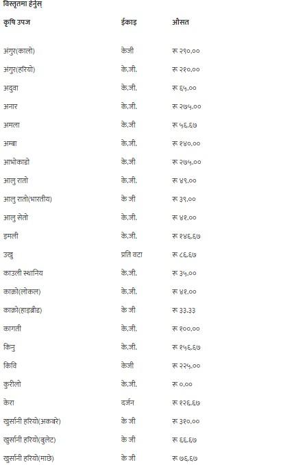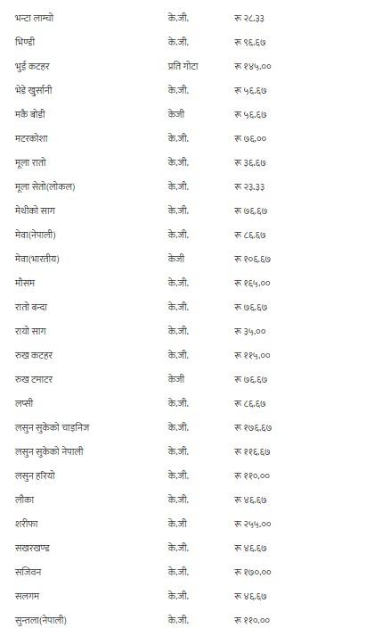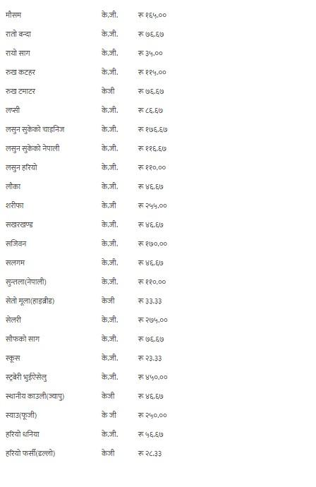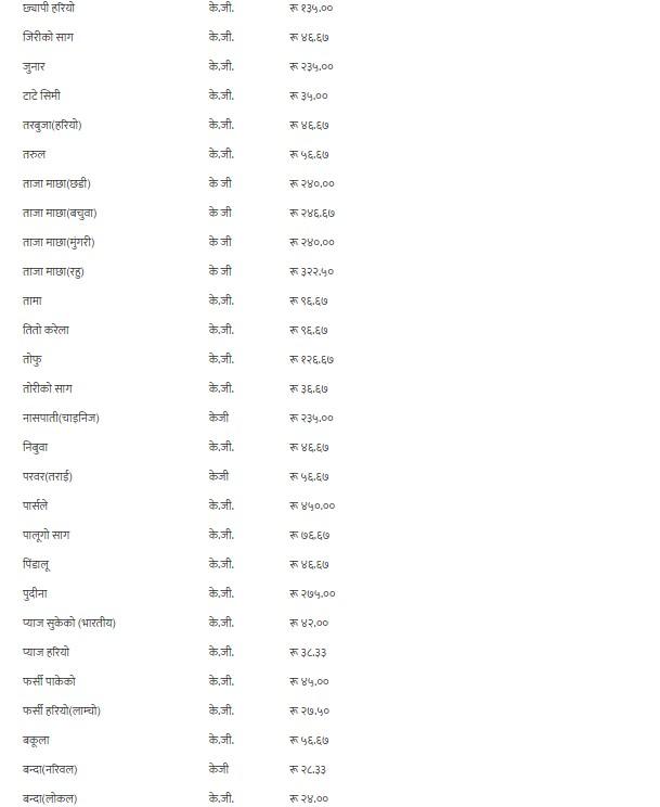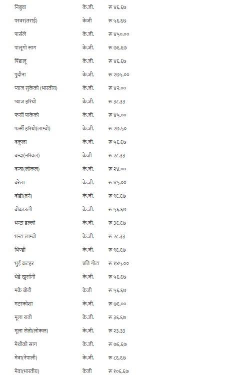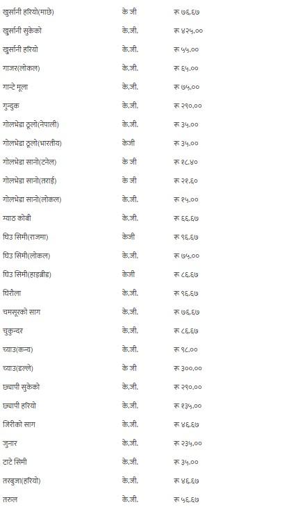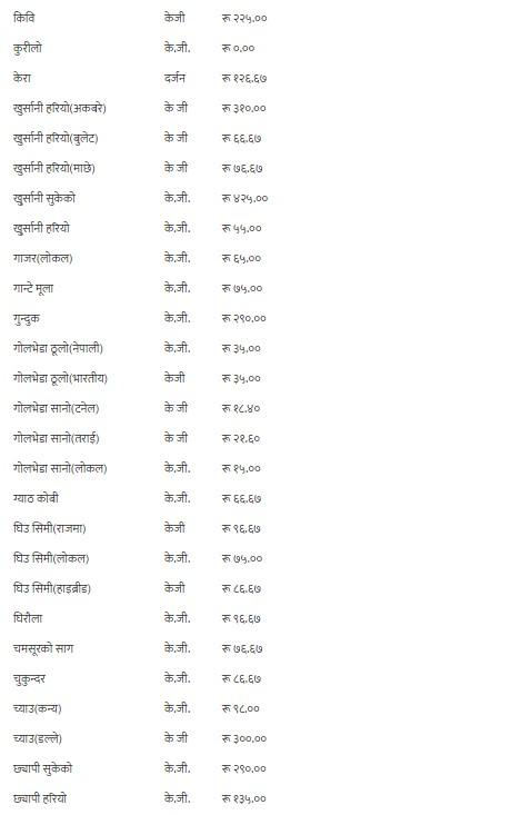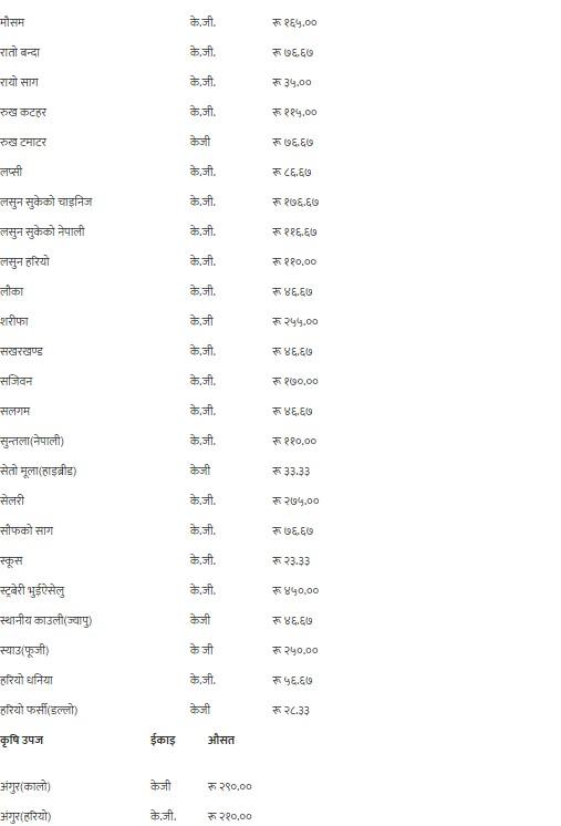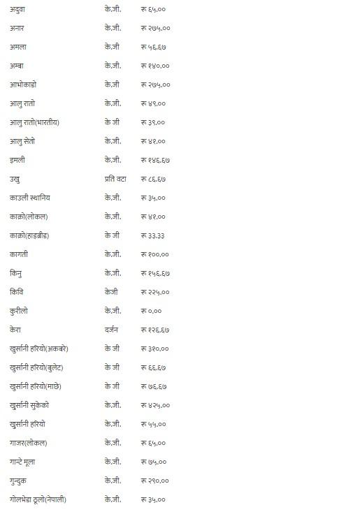 यसैगरी, कालो अंगुर, गुन्दुक र सुकेको छ्यापी २९० रुपैयाँ, हरियो अंगुर २१० रुपैयाँ, अदुवा र लोक गाजर ६५ रुपैयाँ, अनार, आभोकाडो, पुदीना र सेलरी २७५ रुपैयाँ, अमला ५६ रुपैयाँ ६७ पैसा, अम्बा १४० रुपैयाँ, रातो आलु ४९ रुपैयाँ, भारतीय रातो आलु ३९ रुपैयाँ, सेतो आलु र लोकल काक्रो ४१ रुपैयाँ, इमली १४६ रुपैयाँ ६७ पैसा, उखु प्रतिवटा ८६ रुपैयाँ ६७ पैसा, स्थानीय काउली, रायोको साग, टाटे सिमी र गोलभेडाको औसत मूल्य प्रतिकेजी ३५ रुपैयाँमा कारोबार भइरहेको छ ।