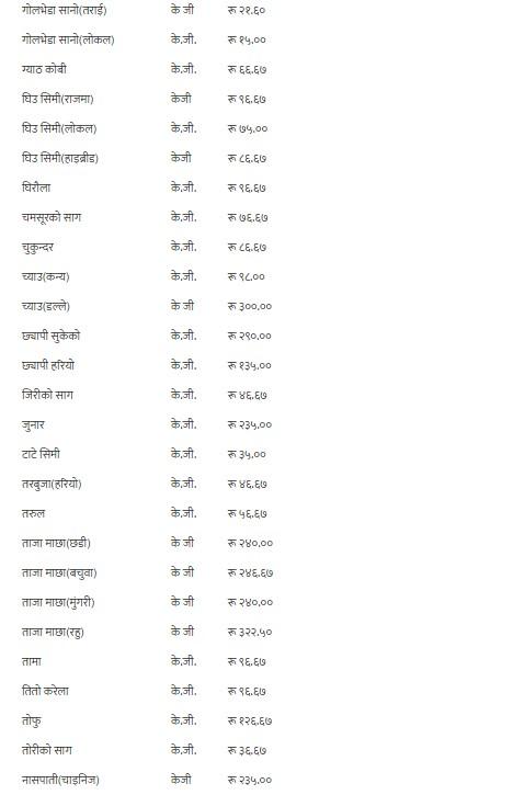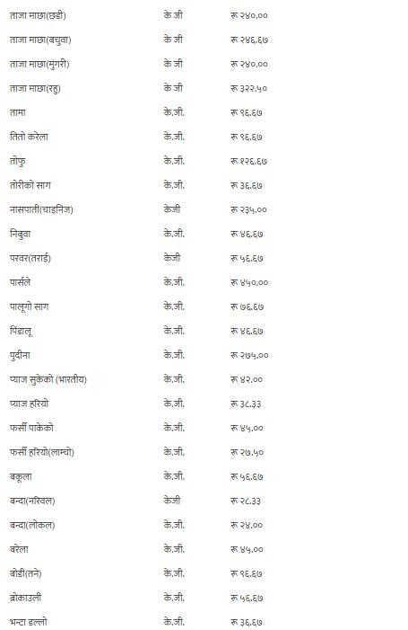 त्यस्तै, छडी माछा प्रतिकेजी २४० रुपैयाँ, मुंगरी माछा २४० रुपैयाँ, बचुवा माछा २४६५ रुपैयाँ ६७ पैसा, रहु माछा ३२२ रुपैयाँ ५० पैसा, तामा ९६ रुपैयाँ ६७ पैसा, तितो करेला ९६ रुपैयाँ ६७ पैसा, तोफु १२६ रुपैयाँ ६७ पैसा, सुकेको भारतीय प्याज ४२ रुपैयाँ, लोकल बन्दा २४ रुपैयाँ, बरेला ४५ रुपैयाँ, ब्रोकाउली ५६ रुपैयाँ ६७ पैसा, तने बोडी ९६ रुपैयाँ ६७ पैसा र भिण्डी ९६ रुपैयाँ ६७ पैसामा कारोबार भइरहेको समितिले जनाएको छ ।