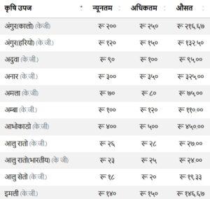 कालीमाटी फलफूल तथा तरकारी बजार विकास समितिका अनुसार शनिबार कालो अंगुरको औसत मूल्य प्रतिकेजी २१६ रुपैयाँ , हरियो अंगुर प्रतिकेजी १३२ रुपैयाँ, यस्तै, रातो आलु २७ रुपैयाँ, सेतो आलु १९, स्थानीय काउली २५ रुपैयाँ, कागती १६३ रुपैयाँ, किबि ३२५ रुपैयाँ, अकबरे खुर्सानी २७५ रुपैयाँ,लोकल गाँजरको औसत मूल्य प्रतिकेजी २८ रुपैयाँ, गान्टे मूला ५७ रुपैयाँ, गुन्दुक २७५ रुपैयाँ, टनेल गोलभेडा १८ रुपैयाँ कायम रहेको छ ।