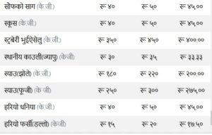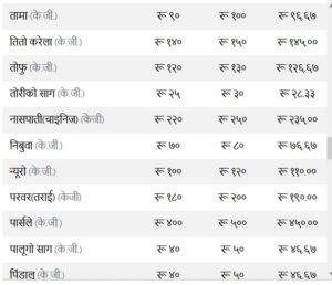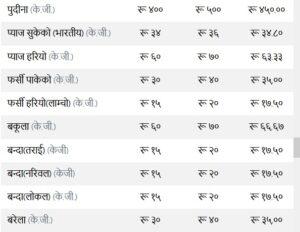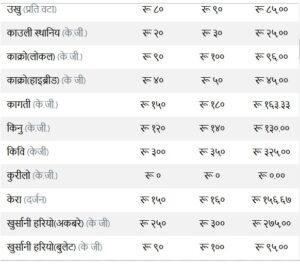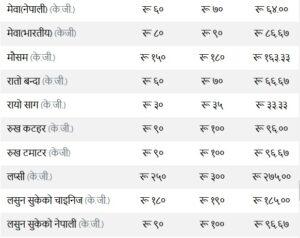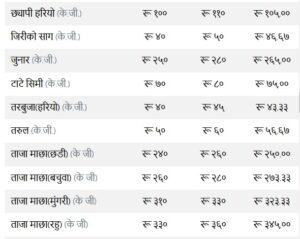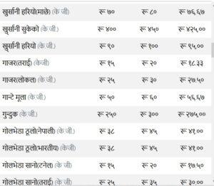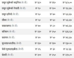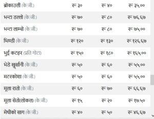 त्यस्तै, कन्य च्याउ ११० रुपैयाँ, तितो करेला १४५ रुपैयाँ, रायोको साग ३३ रुपैया, परवर तराई १९० रुपैयाँ, भारतीय सुकेको प्याज ३५ रुपैयाँ, हरियो प्याज ६३ र हरियो धनिया ४५ तोकेको छ ।