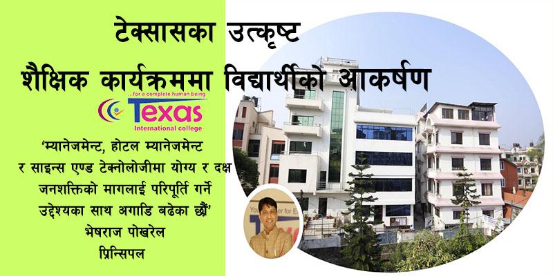 काठमाडौं – शिक्षा तथा व्यावसायिक क्षेत्रमा लामो अनुभव संगालेका तथा क्षमतावान व्यक्तिहरूको आबद्धतामा देश तथा विदेशमा प्रतिस्पर्धा गर्नसक्ने दक्ष जनशक्ति उत्पादन गर्ने लक्ष्यसहित सञ्चालित कलेज हो टेक्सास इन्टरनेशनल कलेज र टेक्सास कलेज अफ म्यानेजमेन्ट एण्ड आइटी ।