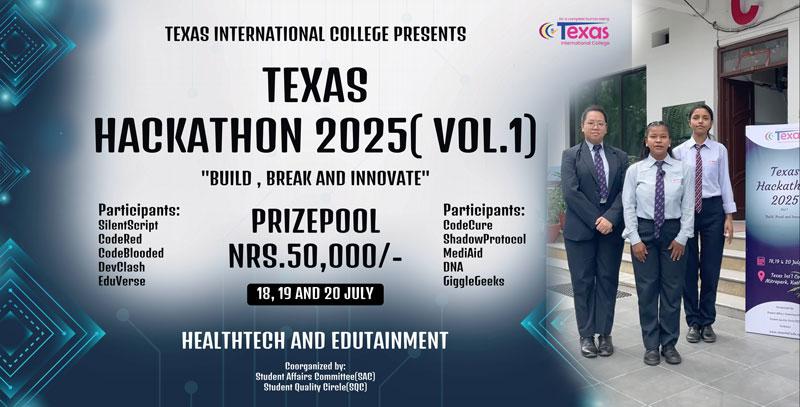 काठमाडौं । टेक्सास इन्टरनेशनल कलेजमा ‘टेक्सास ह्याकाथन – २०२५’ सुरु भएको छ । बिएससी सिएसआइटी र बिसिए कार्यक्रमका विद्यार्थीहरू मिलेर बनेका १० टोलीहरू प्रतिस्पर्धामा सहभागी भएका छन् ।