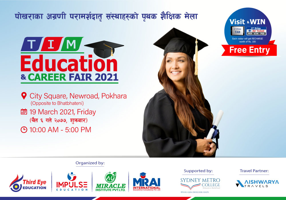 पोखरा । पोखराको न्युरोडस्थित सिटी स्क्वायरमा भोलि शुक्रबार हुने टिआइएम एजुकेशन एण्ड करियर फेयर २०२१ को तयारी पुरा भएको छ । थर्डआई एजुकेशन, इम्पल्स एजुकेशन, मिराकल इन्स्टिच्युट प्रालि र मिराई इन्टरनेशनल एजुकेशनको संयुक्त आयोजनमा फेयर हुन लागेको हो ।