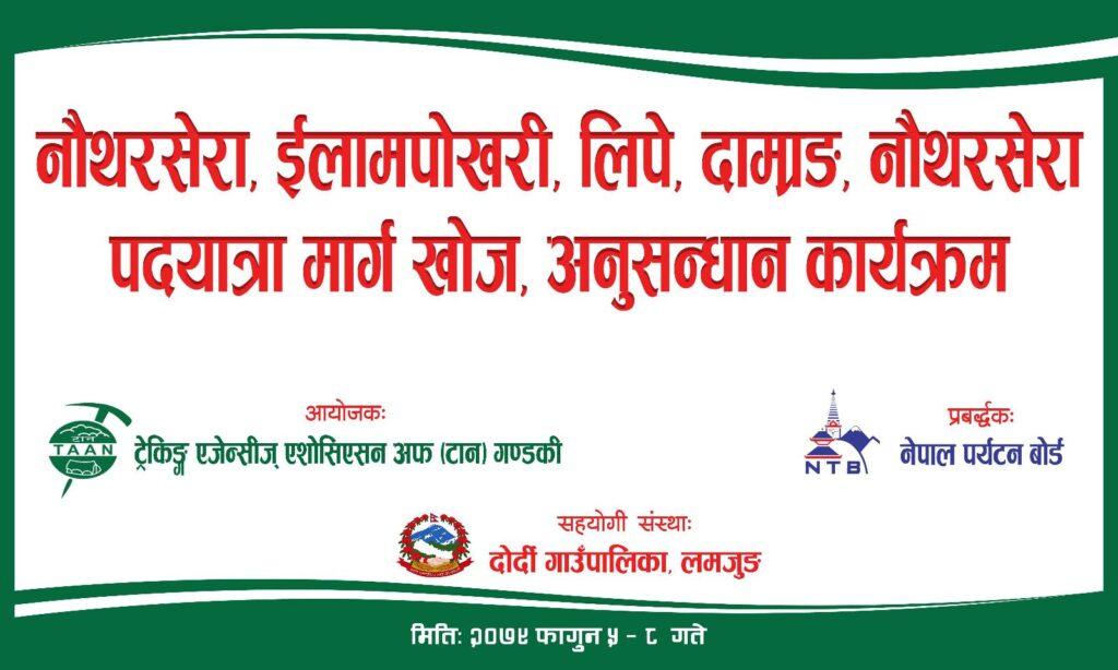 काठमाडौं । लमजुङको दोर्दी गाउँपालिकाले स्थानीय पर्यटकीय गन्तव्य ”लिपे लेक” लाई प्रवर्द्धन गर्न राउन्ड ट्रेक कार्यक्रम सुरु गरेको छ । ट्रेकिङ एजेन्सी एसोसियसन अफ नेपाल (टान) गण्डकी प्रदेश समितिसँगको सहकार्यमा गाउँपालिकाले शुक्रबारदेखि राउन्ड ट्रेक सुरु गरेको हो ।