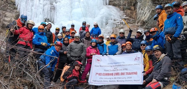 काठमाडौं । नेपाल पर्यटन बोर्डले नेपाल माउन्टेन इन्स्ट्रक्टर्स एसोसिएसन ९एनएमआईए०को सहकार्यमा मनाङको हुम्देमा सातौँ आइस क्लाइम्बिङ लेभल–वानतालिम सुरु भएको छ । माघ १३ देखि २२ गतेसम्म सञ्चालन हुने यो तालिम हिमाली  क्षेत्रमा हुने प्राविधिक तथा व्यवहारिक अभ्यासमा केन्द्रित छ । कार्यक्रम माघ ९ गते काठमाडौंमा ‘सफ्ट ओपनिङ’ गर्दै सुरु भएको थियो । उक्त औपचारिक कार्यक्रममा सहभागीहरूलाई सैद्धान्तिक कक्षा तथा व्यवहारिक पाटोबारे अभिमुखीकरण प्रदान गरी उच्च हिमाली क्षेत्रमा हुने फिल्ड–आधारित तालिमका लागि तयार पारिएको थियो ।