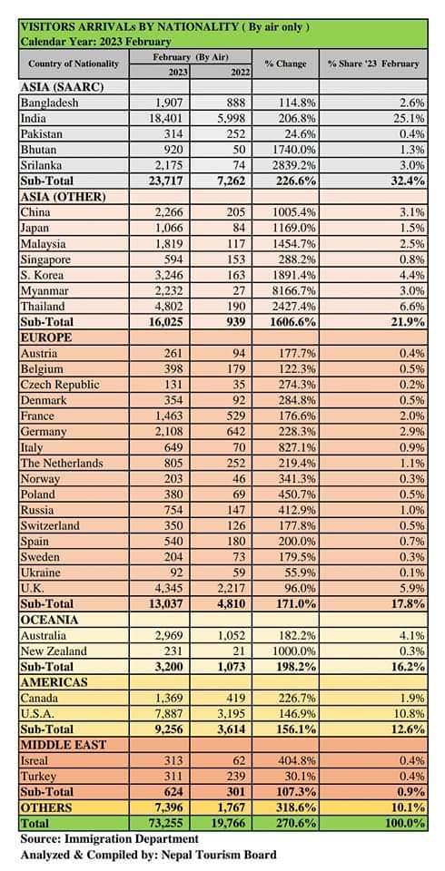 काठमाडौं । नेपालमा सन् २०२३ को फेब्रुअरी महिनामा ७३ हजार २५५ पर्यटक भित्रिएका छन् ।नेपाल पर्यटन बोर्डका निर्देशक मणिराज लामिछानेका अनुसार फेब्रुअरी महिनामा विभिन्न मुलुकबाट ७३ हजार २५५ पर्यटक भित्रिएका हुन् ।