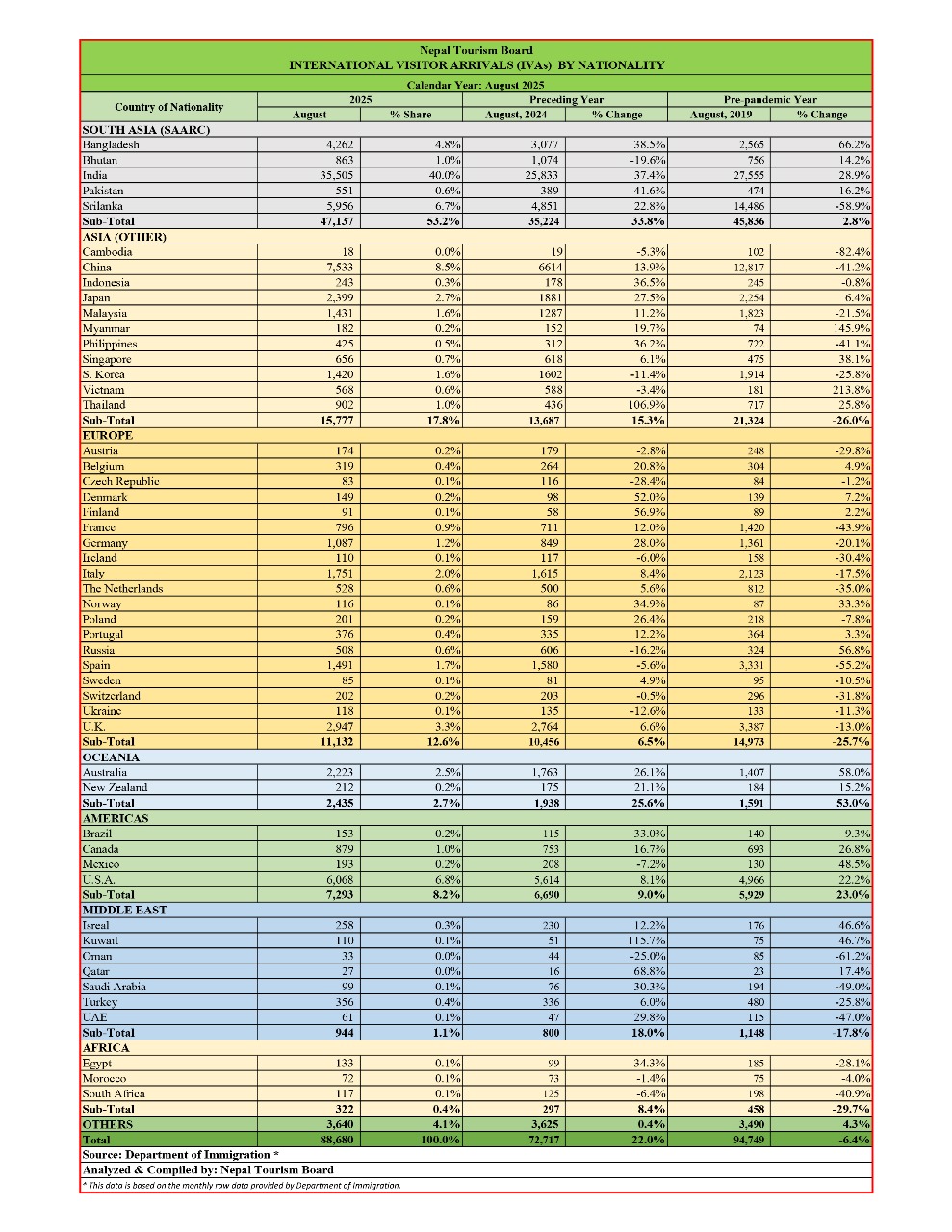 काठमाडौं । सन् २०२५ को अगस्तमा ८८ हजार ६८० पर्यटक आगमन भएको छ । नेपाल पर्यटन बोर्डले सोमबार सार्वजनिक गरेको तथ्यांक अनुसार गत वर्षको तुलनामा यस वर्षको अगस्तमा २२ प्रतिशत पर्यटक वृद्धि भएको देखिएको हो ।
