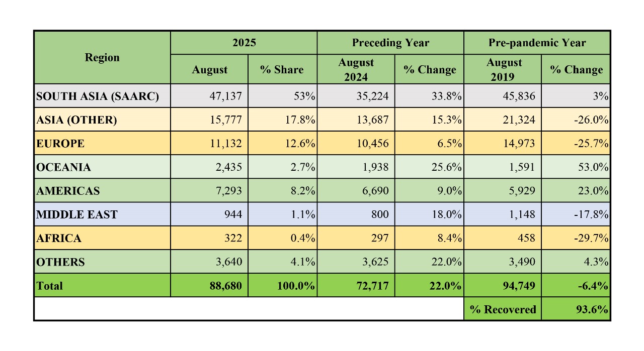 सन् २०२५ को जनवरीदेखि अगस्तसम्म ८ महिनाको अवधिमा सात लाद ३६ हजार ५६२ पर्यटक भित्रिएका छन् । बोर्डले सार्वजनिक गरेको तथ्यांक अनुसार क्षेत्रगत रुपमा हेर्दा दक्षिण एसियाली (सार्क) मुलकबाट ४७ हजार १३७ पर्यटक अर्थात ५३ प्रतिशत आगमन भएको देखिन्छ भने एसियाका अन्य मुलुकमा १५ हजार ७७७ अर्थात्