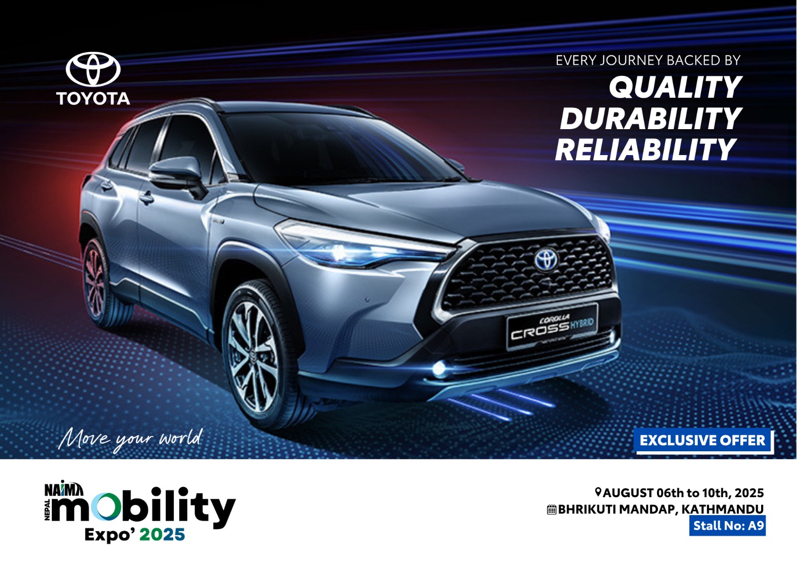 साउन २१ देखि २५ गतेसम्म काठमाडौंको भृकुटीमण्डपमा हुने एक्स्पोमा टोयोटाका चर्चित मोडलहरू यारिस क्रस हाइब्रिड इलेक्ट्रिक र ल्यान्ड क्रुजर २५० सहितका गाडीहरू प्रदर्शनीमा राखिनेछन् ।