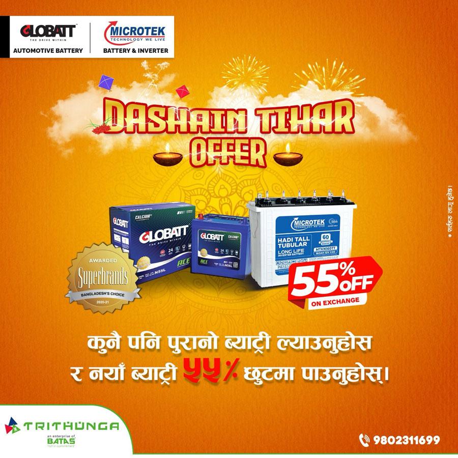 अफर योजना अन्तर्गत दशैँ र तिहारको अवसरमा ग्राहकले कुनैपनि ब्राण्डको पुरानो ब्याट्री लिएर आउँदा नयाँ ब्याट्रीको खरीदमा एमआरपीमा ५५ प्रतिशतसम्म छुट पाउने भएका छन् । सीमित अवधिको यो योजना ग्लोब्याट अटोमोटिभ ब्याट्री र माइक्रोटेक इन्भर्टर र इन्भर्टर ब्याट्री दुवैमा लागु हुने कम्पनीले जनाएको छ ।