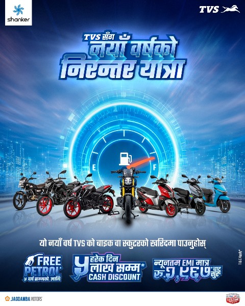 “हामी सधैं ग्राहक केन्द्रित र नवीन विशेष प्रस्तावहरू ल्याउन प्रतिबद्ध छौं। यो नयाँ वर्ष विशेष प्रस्ताव त्यसैको निरन्तरता हो, जसले किफायतीपन, उत्साह र वास्तविक फाइदाहरूलाई एकसाथ ल्याएर टिभिएस स्वामित्व अनुभवलाई अझ उत्कृष्ट बनाउँछ। “साथै, यो अफर नगद, एक्सचेन्ज तथा फाइनान्स—तीनै माध्यममा उपलब्ध रहेको छ।” हामीले कुनै पनि ब्रान्डका पुराना मोटरसाइकल र स्कूटर मा उत्कृष्ट मूल्याङ्कन प्रदान गर्ने प्रतिबद्धता लिएका छौं। यस सुखद अवसरमा सम्पूर्ण नेपाली दाजुभाइ तथा दिदीबहिनीहरूमा नयाँ वर्ष २०८३ को हार्दिक शुभकामना व्यक्त गर्दछु,” जगदम्बा मोटर्सका उपाध्यक्ष दिपक रौनियारले भने ।