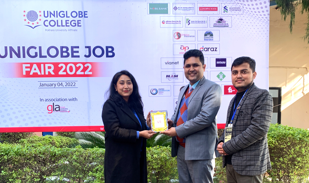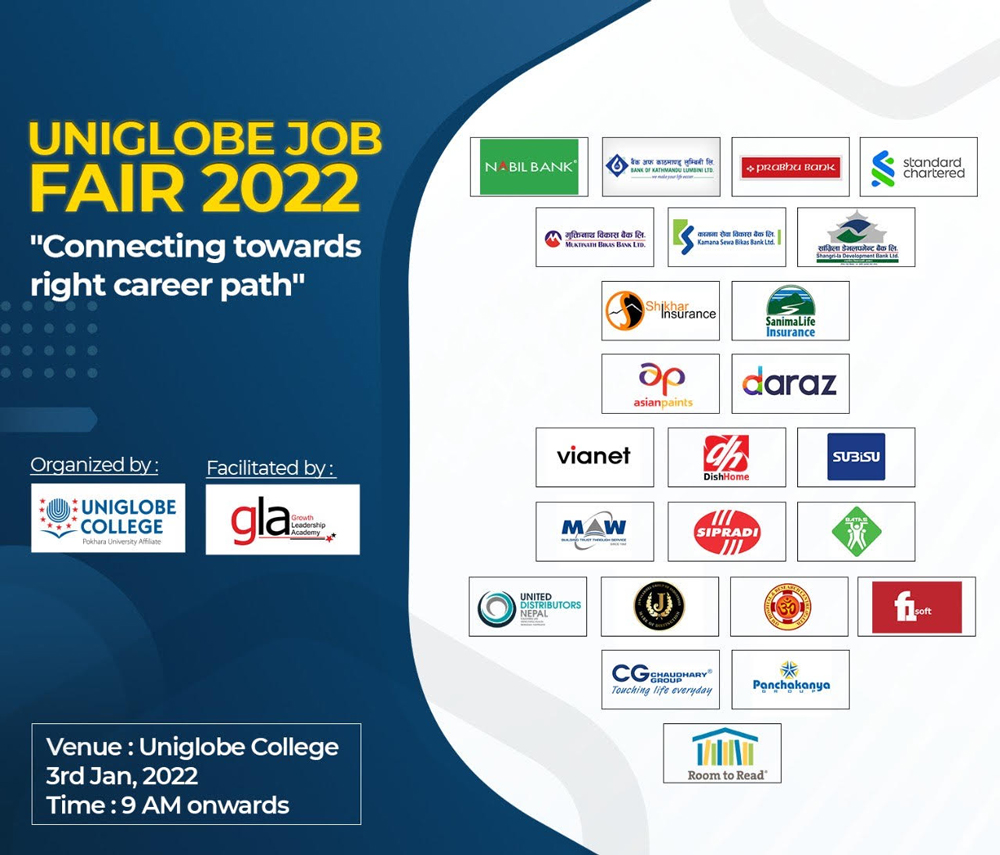 काठमाडौं । युनिग्लोब कलेजको आयोजनामा ‘युनिग्लोब जब फेयर–२०२२’ सम्पन्न भएको छ । काठमाडौंको बानेश्वरस्थित कलेज परिसरमै सोमबार फेयर भएको हो । कलेजबाट पासआउट भएका विद्यार्थीलाई बैंक, वित्तीय संस्था तथा प्रतिष्ठित कर्पोरेट ग्रुपहरुमा रोजगारीको अवसर सिर्जना गर्ने मुख्य लक्ष्यसहित फेयर आयोजना गरिएको हो ।