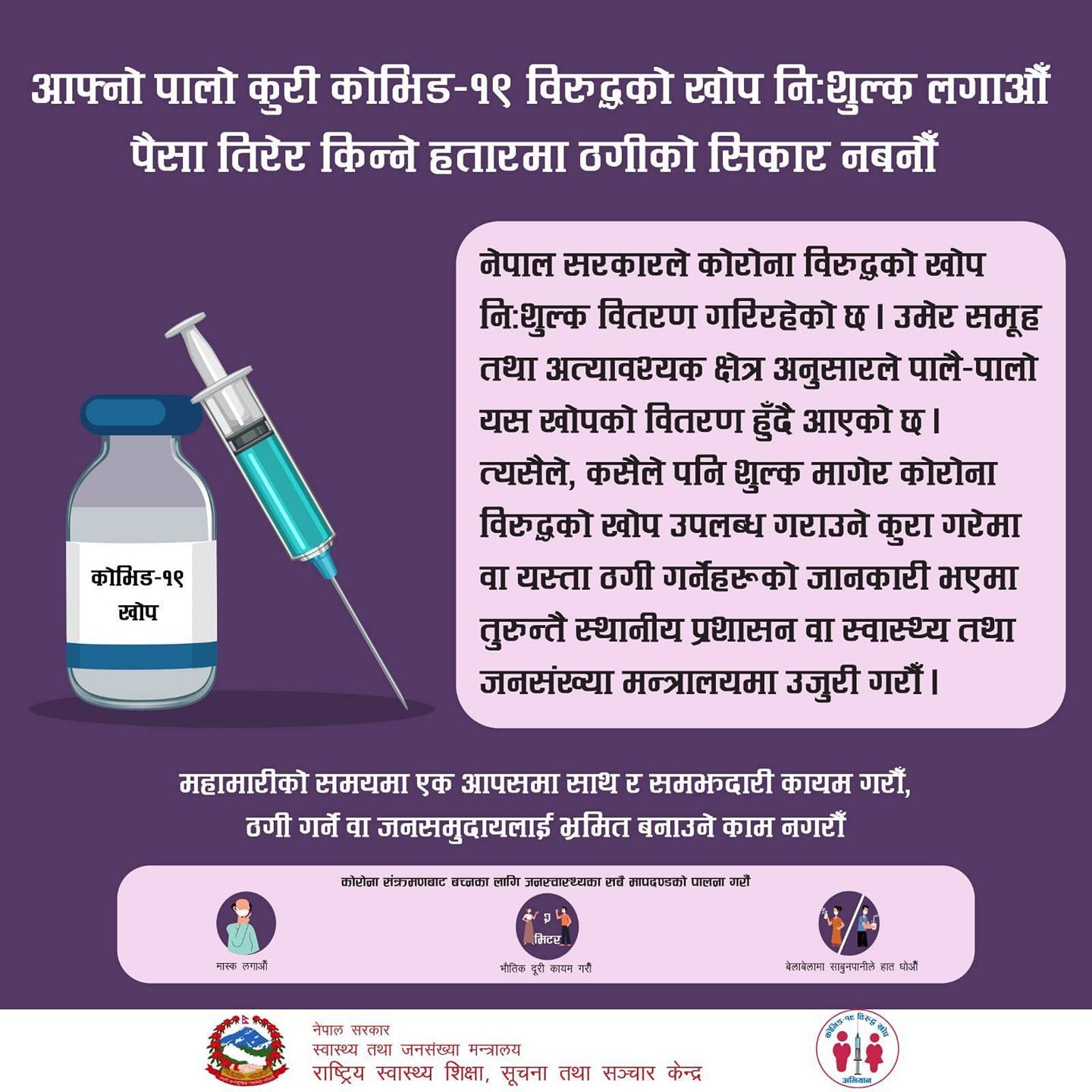 मन्त्रालयले पैसा तिरेर खोप किन्न हतार नगर्न अनुरोध समेत गरेको छ । मन्त्रालयले शुल्क लिएर खोप उपलब्ध गराउनेलाई कारवाही गर्ने जनाएको छ । “सरकारले कोरोना भाइरस विरुद्धको खोप निःशुल्क विवरण गर्दै आइरहेको छ”,सूचनामा भनिएको छ, “ त्यसैले कसैले पनि शुल्क मागेर खोप उपलब्ध गराउने कुरा गरेमा वा त्यस्ता ठगी गर्नेको जानकारी तुरुन्तै स्थानीय प्रशासन वा मन्त्रालयमा उजुरी गरौै ।”