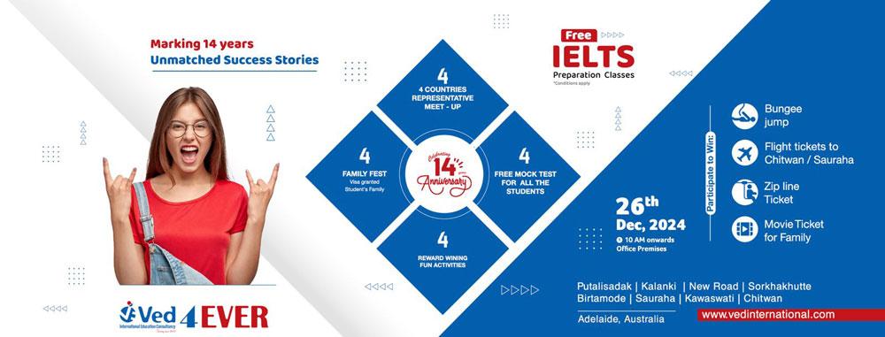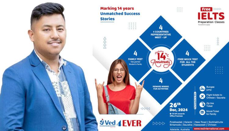 काठमाडौं, १ पुस । वेद इन्टरनेसनल एजुकेशनल कन्सल्टेन्सीले आफ्नो १४औं वार्षिकोत्सव विशेष कार्यक्रमका साथ मनाउने घोषणा गरेको छ । उच्च शिक्षा अध्ययनका लागि विदेश जान चाहने विद्यार्थीलाई सन् २०१० देखि परामर्श सेवा प्रदान गर्दै आइरहेको वेद इन्टरनेशनलले आफ्नो वार्षिकोत्सवलाई थप विशेष बनाउने उद्देश्यले ‘वेद फोर इभर’ (Ved 4 Ever) नामक क्याम्पेन सञ्चालन गर्न लागेको हो । कन्सल्टेन्सीले वार्षिकोत्सवको १५ दिनअघिदेखि नै विभिन्न कार्यक्रमहरू आयोजना गर्ने तयारी गरेको छ । २६ डिसेम्बरमा वेदले वार्षिकोत्सव मनाउँदैछ ।