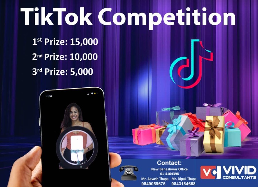 काठमाडौं । विविध कन्सल्ट्यान्ट्सको आयोजनामा टिकटक प्रतियोगिता हुने भएको छ । प्रतियोगितामा प्रथम हुनेले १५ हजार रुपैयाँ, द्वितीय हुनेले १० हजार रुपैयाँ र तृतिय हुनेले ५ हजार रुपैयाँ पुरस्कार प्राप्त गर्नेछन् । प्रतियोगितामा सहभागी हरेक प्रतियोगीले गिफ्ट ह्याम्पर को व्यवस्था गरिएको बताइएको छ ।