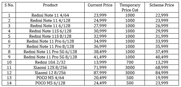 यो अफर अन्तर्गत उपभोक्ताहरुले रेडमी नोट ११ सिरिजमा १ हजार रुपैया छुुट, शाओमी १२ सिरिजमा ३ हजार रुपैयाँ छुुट भर्खरै लन्च गरिएको पीओसीओ एम५ मा ५ सयसम्मको कम मुल्यमा मोबाइल सेट खरिद गर्न सक्नेछन् । सिमित अवधिको लागि मान्य यो अफर असोज २४ गते देखि कार्तिक १४ गते सम्म लागु हुनेछ ।