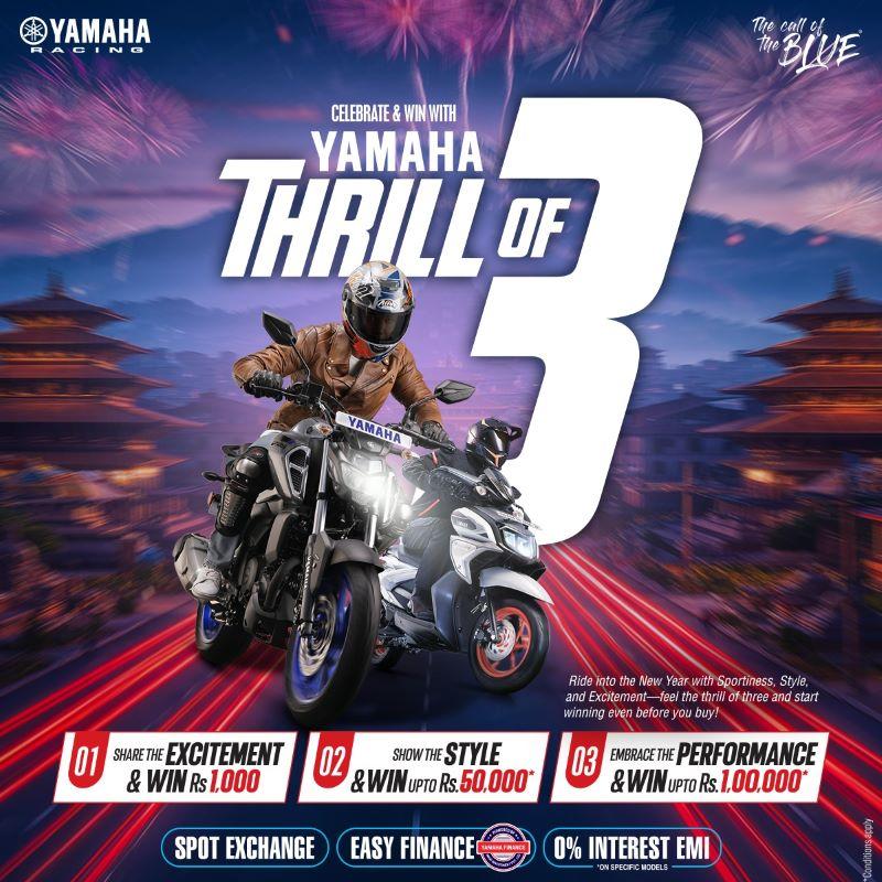 यो स्किमयामाहा मोटरसाइकल र स्कुटरको सारलाई प्रतिबिम्बित गर्दै एक्साइटमेन्ट, स्टाइल र पर्फर्मेन्सको उत्सव मनाउने अवसर पनि हो । ‘थ्रिल अफ थ्री’ अन्तर्गत रोमाञ्चक पुरस्कारमा एक्साइटमेन्ट शेयरमा रु. १ हजार, आफ्नो सामाजिक सञ्जालमा यामाहाको नयाँ वर्ष स्किमको विज्ञापन ‘थ्रिल अफ थ्री’ सेयरमा तत्काल रु. १ हजार, स्टाइल देखाउँदै रु. ५० हजार सम्म जित्ने व्यवस्था रहेको छ ।
