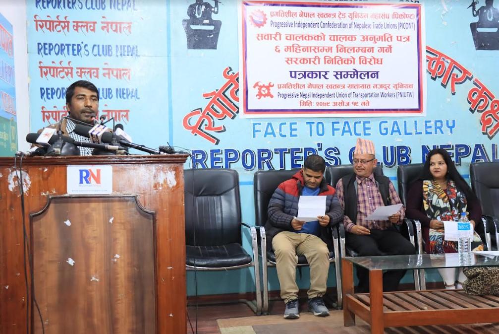 बिहीबार युनियनले रिपोर्टर्स क्लब नेपालमा पत्रकार सम्मेलन गर्दै उक्त सरकारी नीतिको विरोध जनाएको हो । उनीहरुले सवारी तथा यातायात व्यवस्था ऐन र नियमावली १६४ को उपदफा ४ लाई अक्षरंश कार्यान्वयन, सामान्य कमजोरीमा नै चालक अनुमतिपत्र ६ महिनासम्म निलम्बन गर्ने विनियम तत्काल खारेज, हालसम्म ६ महिने निलम्बनमा पारिएका चालकको आश्रित परिवारलाई आवश्यक दैनिक गुजाराको ब्यवस्था र रिङरोड वरिपरि यातायात संचालन गर्ने यातायात श्रमिकको लागि शौचालयको व्यवस्थालगायतका माग राख्दै पत्रकार सम्मेलन गरेका हुन्।