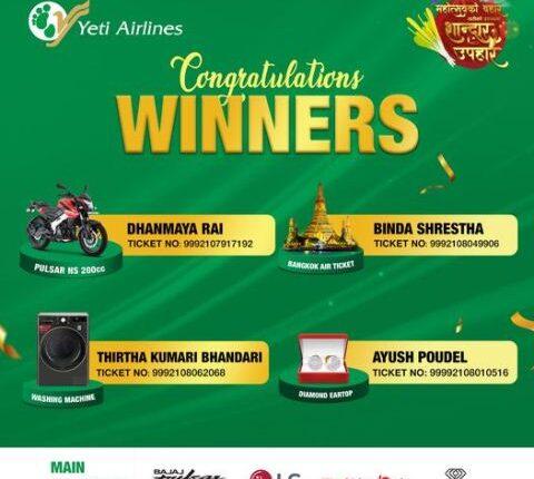 यती एअरलाइन्सले चाडपर्वको समयमा यात्रा गर्ने आफ्ना यात्रुहरुलाई लक्षित गरी असोज २८ (घटस्थापना देखि मंसिर ७ गते (छठ पर्व)सम्म ४० दिनको अवधिभर उडान भर्ने यात्रुबीच ‘लक्की ड्र’ गरेको थियो । सोही अवधिमा करिब एकलाख यात्रुहरुले यती एअरलाइन्समा यात्रा गरेको प्रवक्ता सुदर्शन बर्तौलाले जानकारी दिए । बिजेता यात्रुहरुलाई एअरलाइन्सले सम्पर्क गरी उपहार वितरण गरिने उनले जानकारी दिए ।
