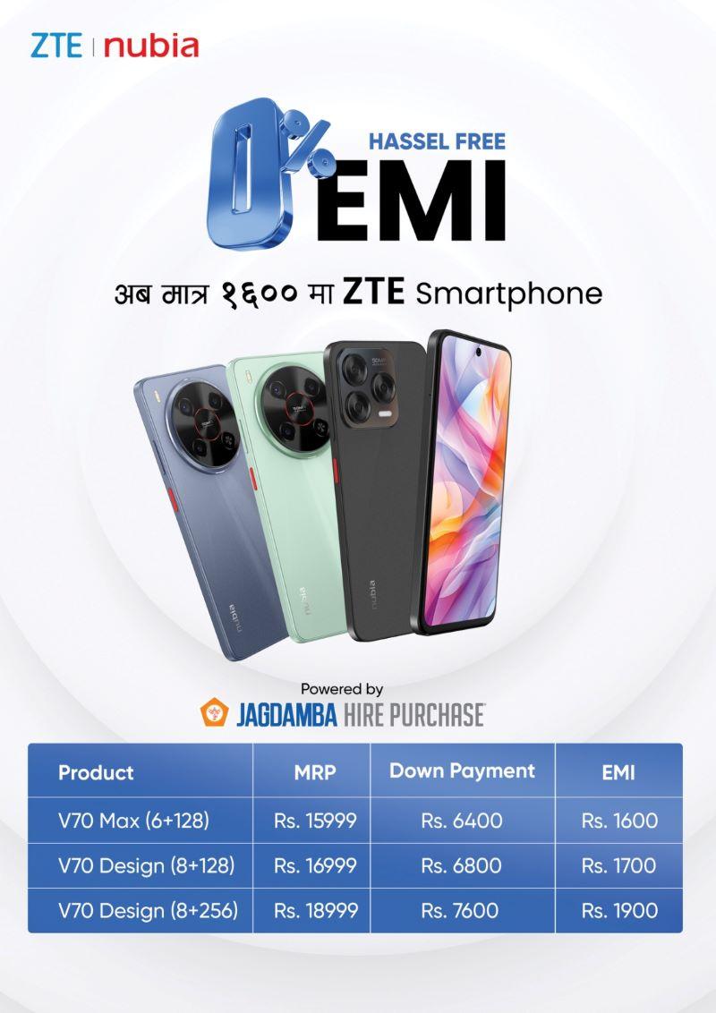 नेपालमा १५ हजार देखि २० हजार रूपैयाँका फोनमा पनि किस्ताबन्दी सुविधा ल्याउने जेडटीई दोस्रो ब्रान्ड बनेको छ, जसले सबै नेपालीका लागि नयाँ प्रविधि अझ पहुँचयोग्य बनाउने कम्पनिको उद्धेश्यलाइ सार्थकता प्रदान गरेको छ । यस शुन्य प्रतिशत ब्याजदर किस्ताबन्दि योजना अनुसार १५ हजार ९९९ मूल्य रहेको भी७० म्याक्स (६+१२८ जिबी) स्मार्टफोन मोडेल खरिद गर्न चाहनेले रूपैयाँ ६ हजार ४०० अग्रिम भुक्तानी गरेपछि बाँकी रकम ६ महिनासम्म मासिक १,६०० किस्तामा तिर्न सकिन्छ ।